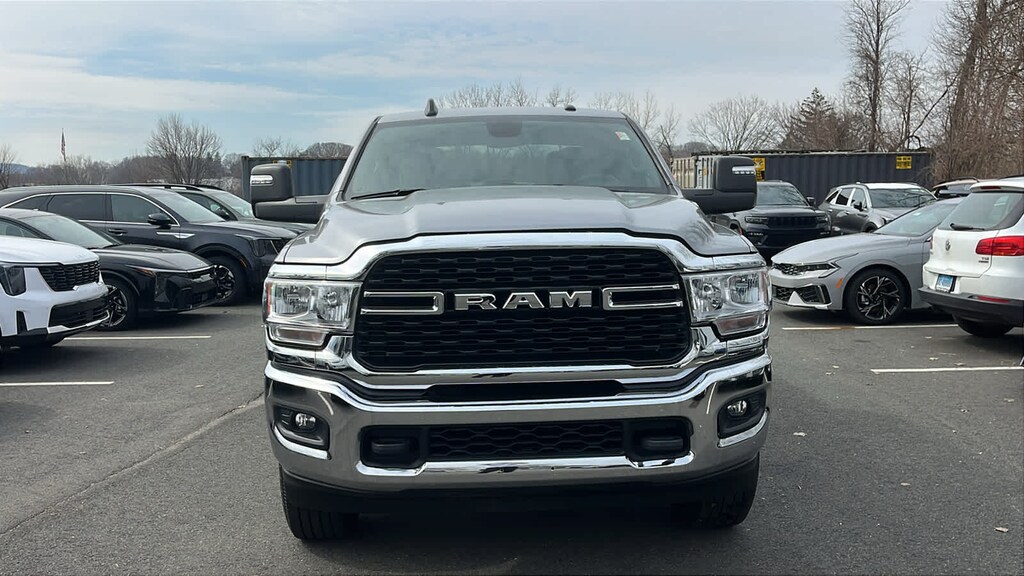 DIESEL GRAY/BLACK, PREMIUM CLOTH 40/20/40 BENCH SEAT Storage Tray, Rear 60/40 Folding Seat, Front Armrest w/Cupholders, Remote USB Port - Charge Only, Front Center Seat Cushion Storage, Manual Adjust 4-Way Front Passenger Seat, Power Adjust 8-Way Driver Seat, Front Seat Back Map Pockets, Power 2-Way Driver Lumbar Adjust, CHROME FLAT CAB-LENGTH SIDE STEPS, 9 ALPINE SPEAKERS W/SUBWOOFER, ANTI-SPIN DIFFERENTIAL REAR AXLE, PROTECTION GROUP Transfer Case Skid Plate Shield, Tow Hooks, LEVEL 1 EQUIPMENT GROUP Google Android Auto®, For Details, Visit DriveUconnect.com, For More Info, Call 800-643-2112, Leather Wrapped Steering Wheel, Rear Dome w/On/Off Switch Lamp, Front Fog Lamps, Glove Box Lamp, Auto Power-Folding Mirrors, Footwell Courtesy Lamp, 4G LTE Wi-Fi Hot Spot, Mirror Running Lights, Radio: Uconnect 5 W w/8.4 Display, 8.4 Touchscreen Display, Foam Bottle Insert (Door Trim Panel), Wheels: 18 x 8.0 Polished Aluminum, Apple CarPlay®, Big Horn IP Badge, Power Adjustable Convex Aux Mirrors, Forward & Reverse Utility Lights, Locking Lower Glove Box, Selectable Tire Fill Alert, SiriusXM Satellite Radio, Power Heated Fold Telescope Mirrors, Exterior Mirrors w/Supplemental Signals, Steering Wheel Mounted Audio Controls, Exterior Mirrors Courtesy Lamps, Dual Glove, TRANSMISSION: 8-SPEED AUTO (8HP75-LCV) (STD), ENGINE: 6.4L V8 HEAVY DUTY HEMI MDS (STD). Ram Big Horn with Billet Silver Metallic Clearcoat exterior and Diesel Gray/Black interior features a 8 Cylinder Engine with 410 HP at 5600 RPM*.