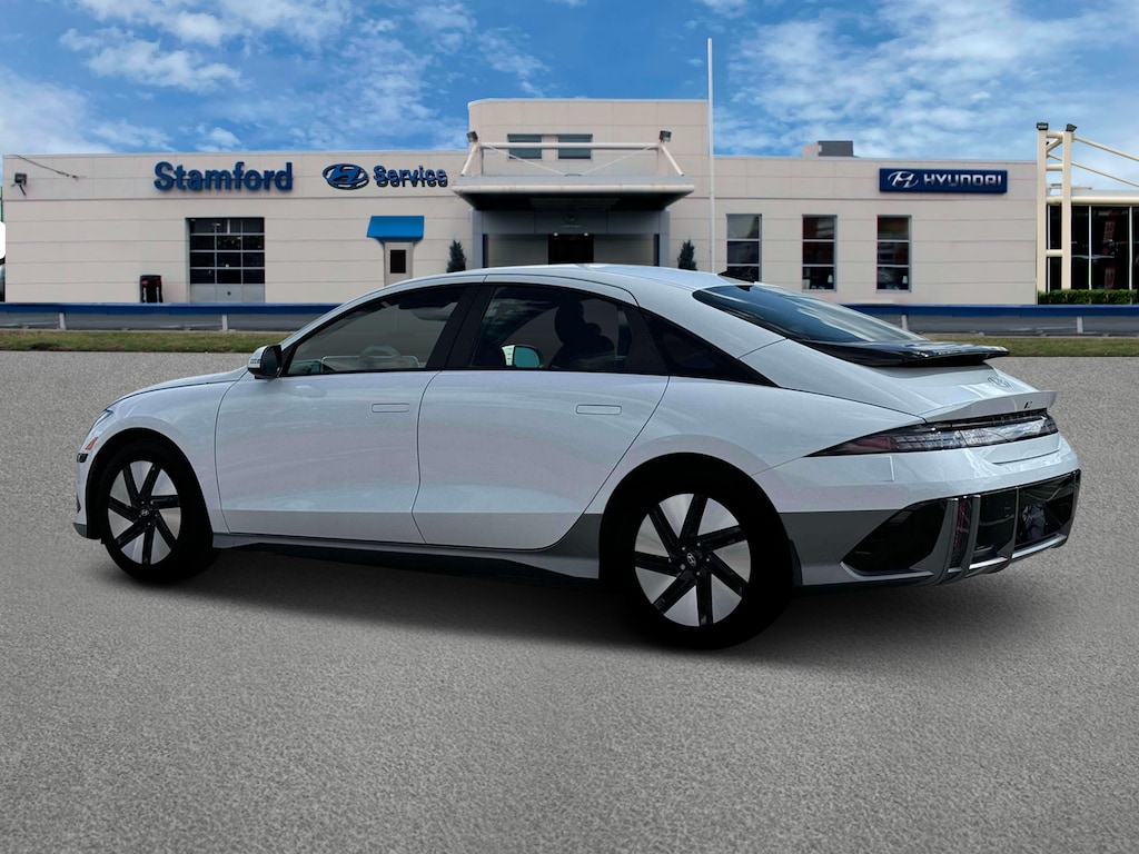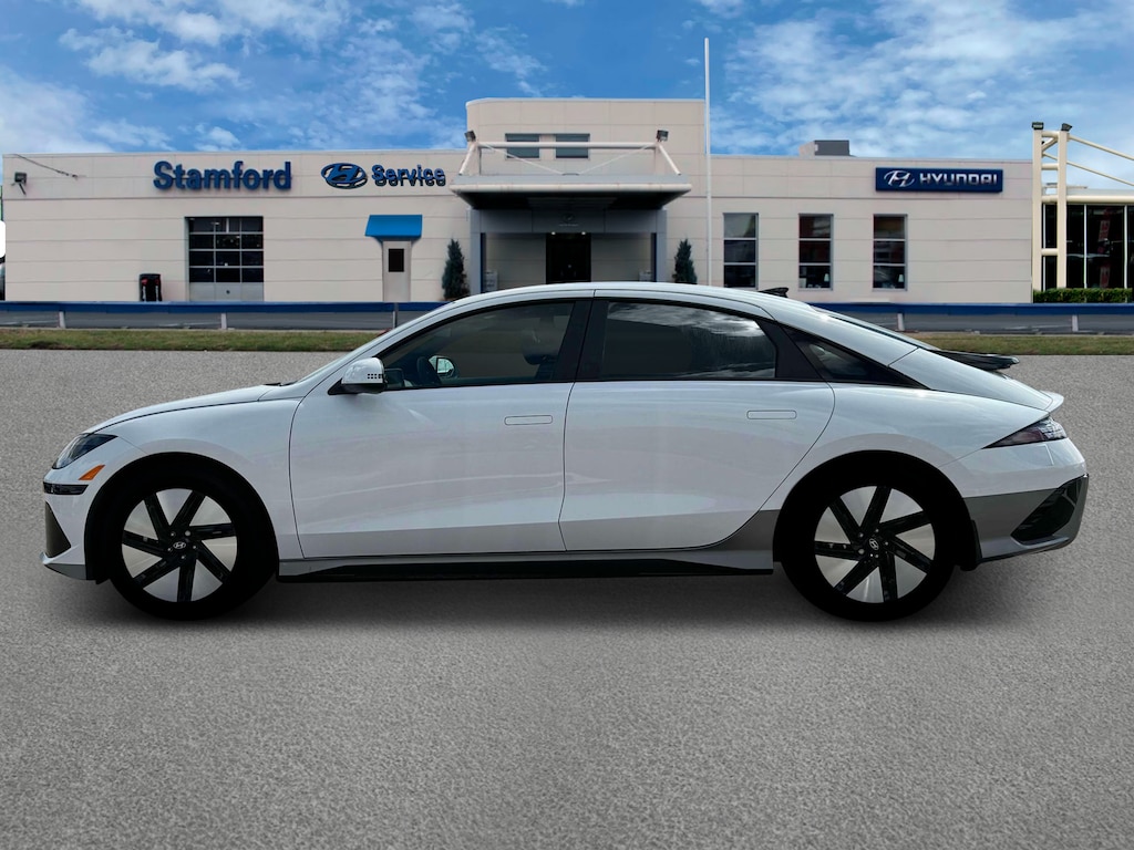 Serenity White 2025 Hyundai IONIQ 6 SE AWD 1-Speed Automatic Electric Motor 4-Wheel Disc Brakes, 6 Speakers, ABS brakes, Air Conditioning, Alloy wheels, AM/FM radio: SiriusXM, Apple CarPlay & Android Auto, Auto High-beam Headlights, Automatic temperature control, Brake assist, Bumpers: body-color, Carpeted Floor Mats, Delay-off headlights, Driver door bin, Driver vanity mirror, Dual front impact airbags, Dual front side impact airbags, Electronic Stability Control, Emergency communication system: Bluelink Connected Car Services (Bluelink+), Envelope Cargo Net, First Aid Kit, Four wheel independent suspension, Front anti-roll bar, Front Bucket Seats, Front Center Armrest, Front dual zone A/C, Front reading lights, Fully automatic headlights, harman/kardon® Speakers, Heated door mirrors, Heated Front Bucket Seats, Heated front seats, Illuminated entry, Leather steering wheel, Low tire pressure warning, Navigation System, Occupant sensing airbag, Option Group 01, Outside temperature display, Overhead airbag, Overhead console, Panic alarm, Passenger door bin, Passenger vanity mirror, Power door mirrors, Power driver seat, Power steering, Power windows, Radio: AM/FM/SiriusXM/HD Radio Audio System, Rear anti-roll bar, Rear Bumper Applique, Rear reading lights, Rear Reversible Cargo Tray, Rear seat center armrest, Rear window defroster, Remote keyless entry, Security system, Speed control, Speed-sensing steering, Split folding rear seat, Spoiler, Stain-Resistant Cloth Seating Surfaces, Steering wheel mounted audio controls, Telescoping steering wheel, Tilt steering wheel, Traction control, Trip computer, Turn signal indicator mirrors, Variably intermittent wipers, Vehicle to Load Adapter, Wheels: 18 x 7.5J Alloy.